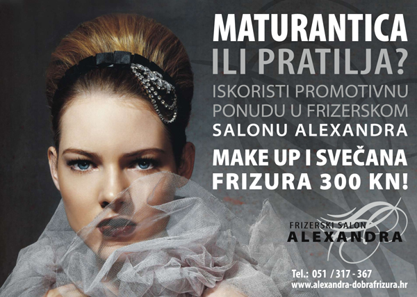 It is prom season and girls should have their best look on such occasion. Once you ladies have picked out a perfect dress, come over and visit Alexandra Hairdressing Salon and choose a perfect haircut to make it a dot on the i, and you will also get a makeup at special price of 300 kn. [more]