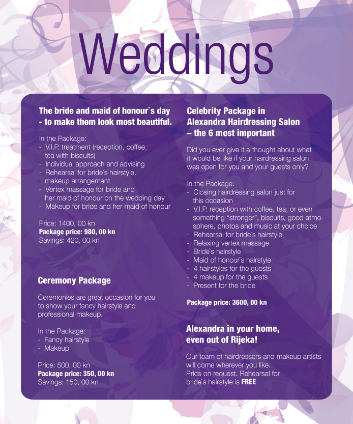 Wedding is a special day for spouses and people who are close to them. Let our hairdressing team and a professional makeup artist give you a beautiful glowing look for that special occasion. We offer you four packages, among which you can choose one that suits you best: The bride and maid of honour`s day – to make them look most beautiful, Ceremony Package, Celebrity Package – the 6 most important, and Alexandra Home Package. [more]